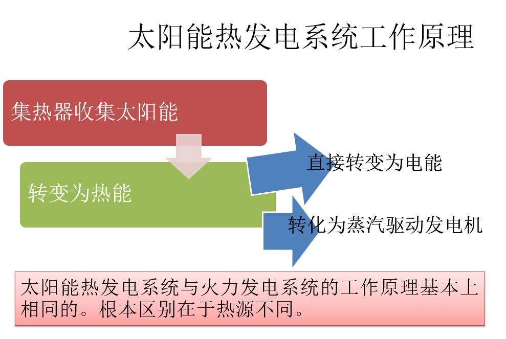 太阳能热发电是先将太阳能转化为热能,再将热能转化成电能,它有两种转化方式:一种是将太阳热能直接转化成电能,如半导体或金属材料的温差发电,真空器件中的热电子和热电离子发电,碱金属热电转换,以及磁流体发电等。(不是光伏)另一种方式是将太阳热能通过热机(如汽轮机)带动发电机发电,与常规热力发电类似,只不过是其热能不是来自燃料,而是来自太阳能。